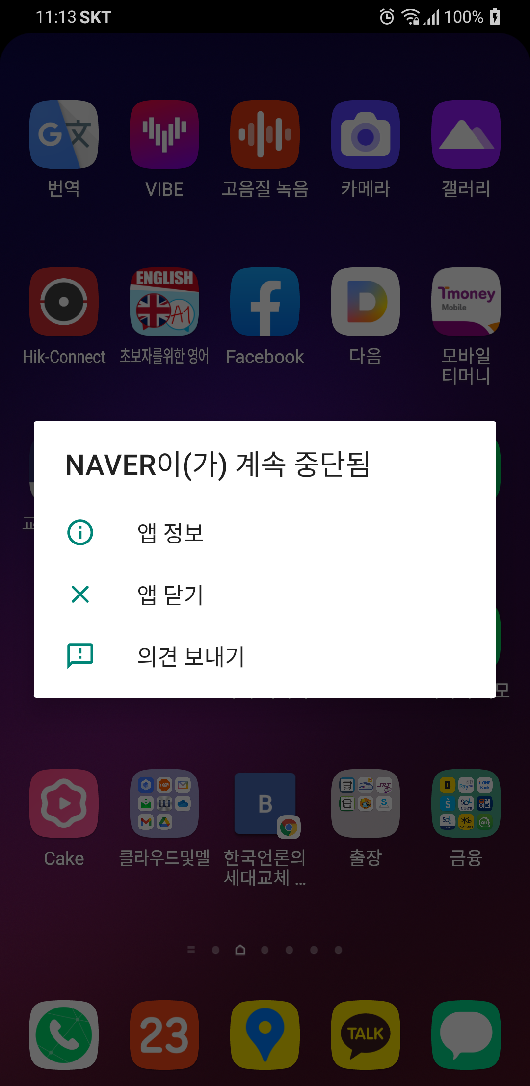 그 다음 네이버나 다른 앱을 실행해도 '앱이 계속 중단됨' 메세지가 뜨지 않습니다.