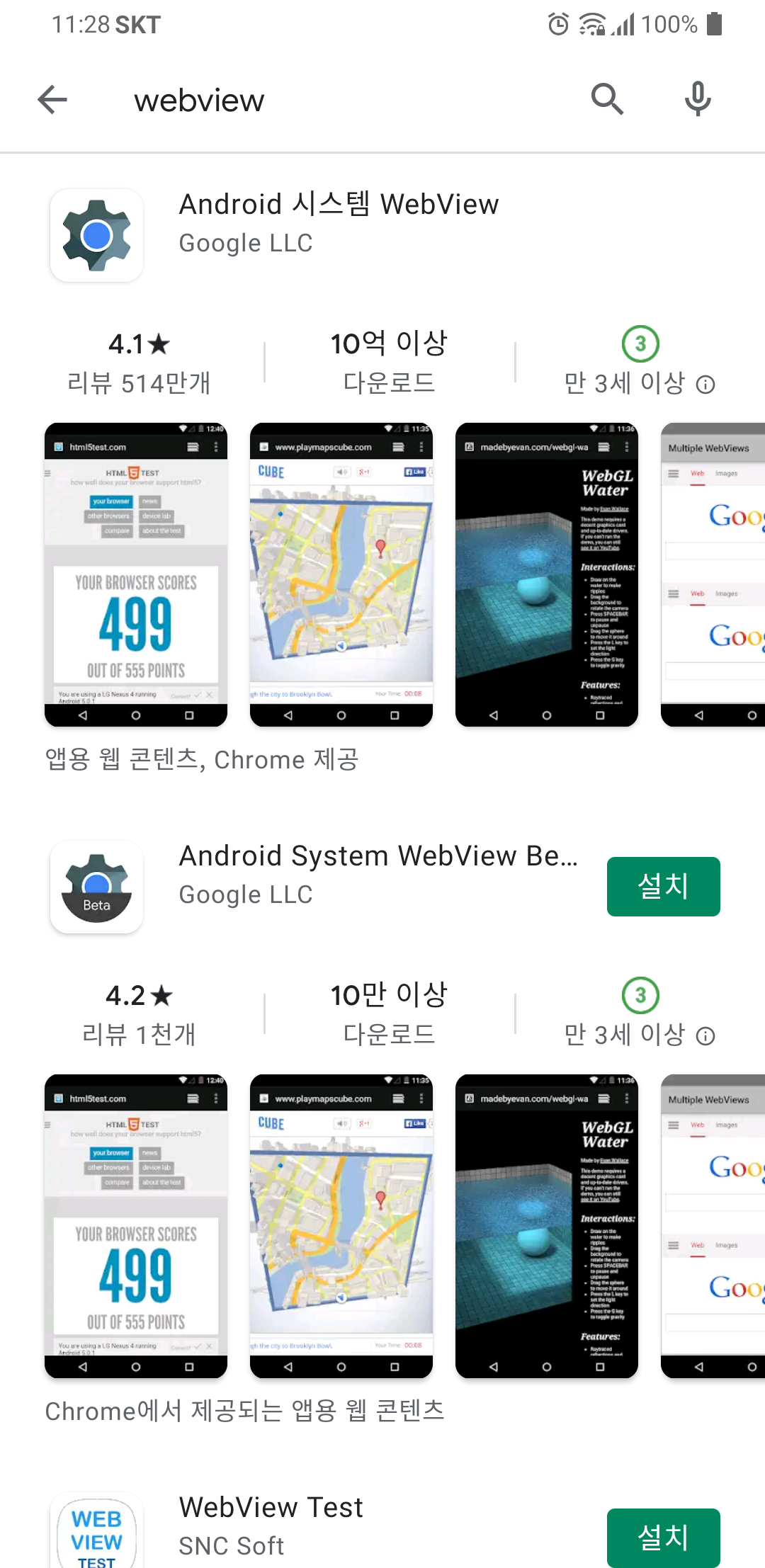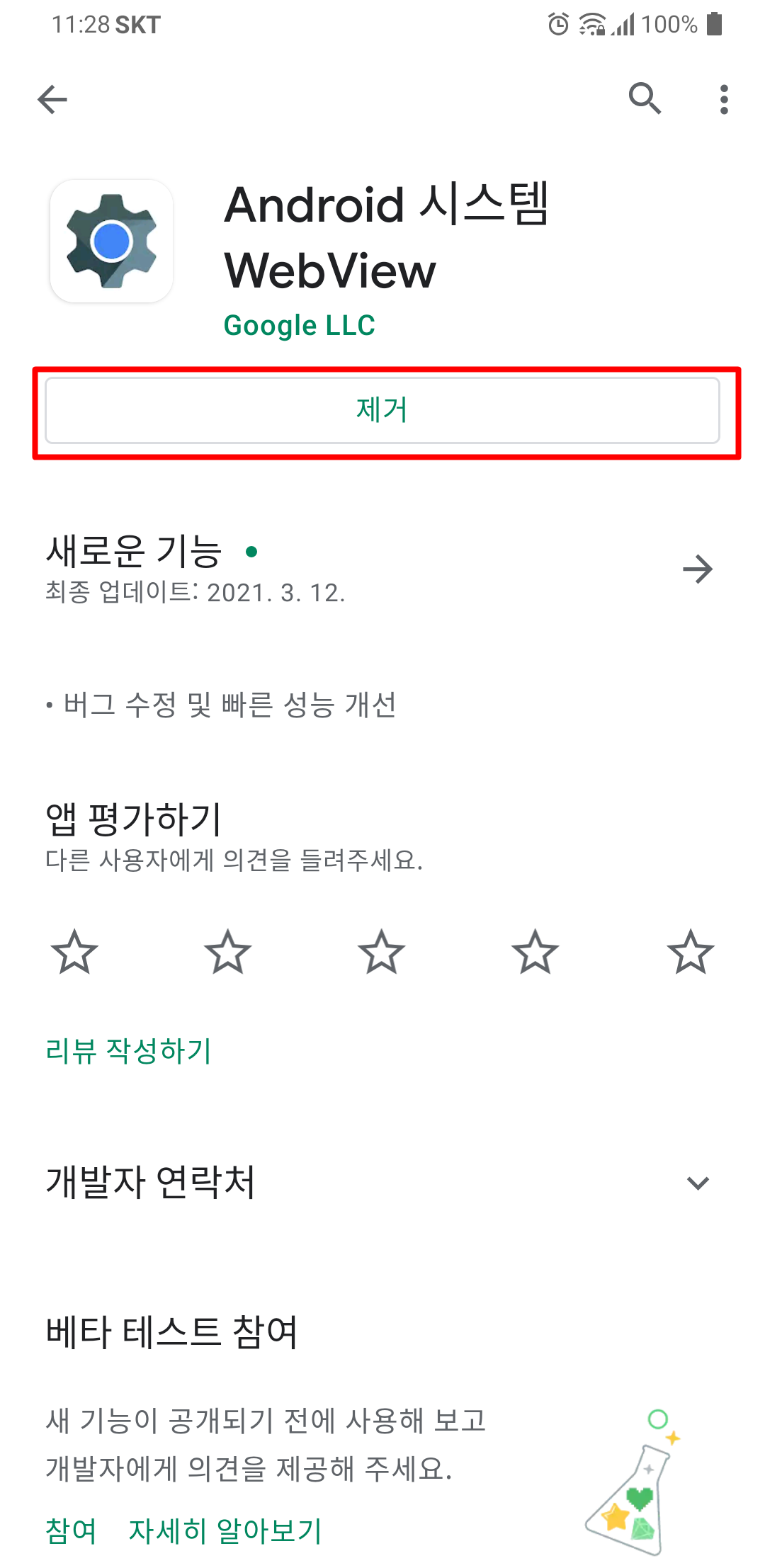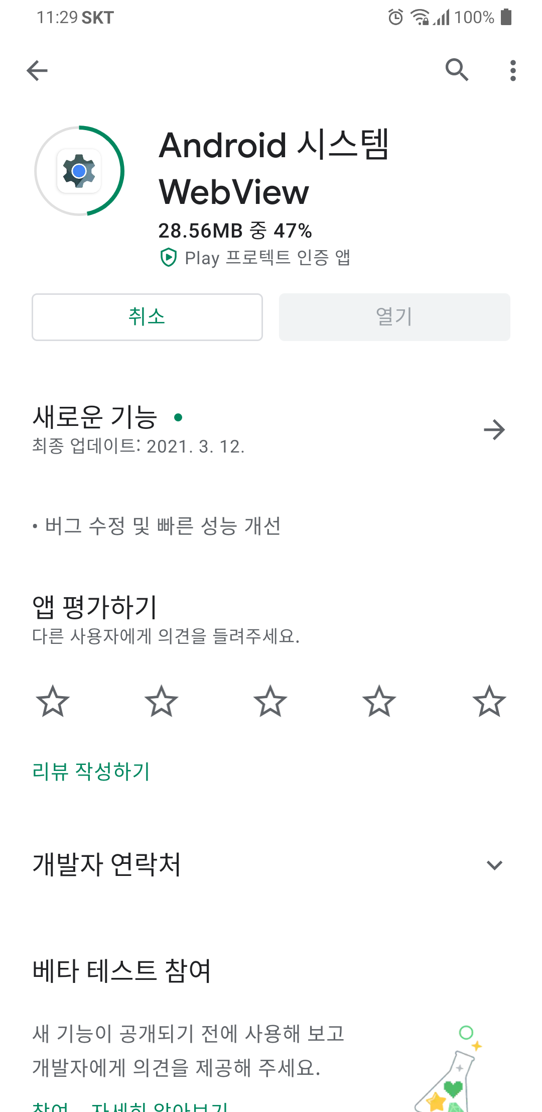 핸드폰을 몇 번 전원을 ON/OFF하고 어플도 여러 번 삭제, 재설치를 했는데도 문제가 해결되지 않았습니다. 여기 저기 서치를 하다가 결국 답을 찾았습니다. 답은 <WEBVIEW> 업데이트 문제였습니다.