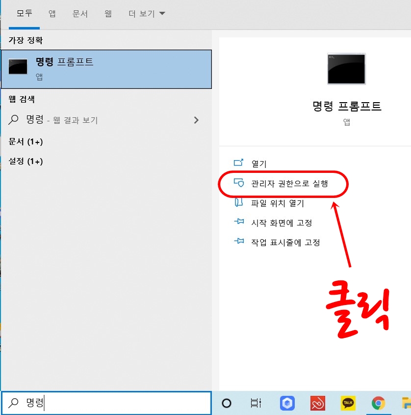 우선 컴퓨터에서 <윈도우키 + R> 또는 윈도우 시작 옆의 검색창에 '명령 프롤프트'를 입력합니다. 명령프롬프트가 검색되고 밑으로 열기, 관리자 권한으로 실행, 파일위치 열기, 시작화면에 고정, 작업표시줄 고정 등이 있습니다. 이중에서 관리자 권한으로 실행을 클릭합니다.