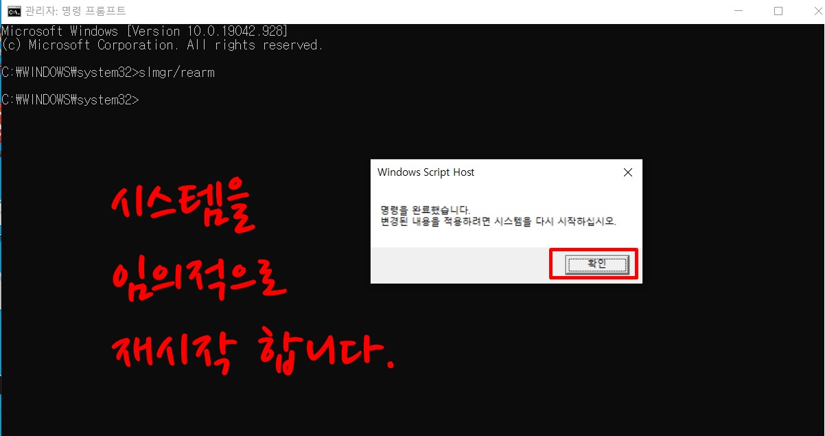 그러면 <명령 프롬프트> 팝업창이 뜹니다. 여기에 <slmgr/rearm>을 입력합니다.
